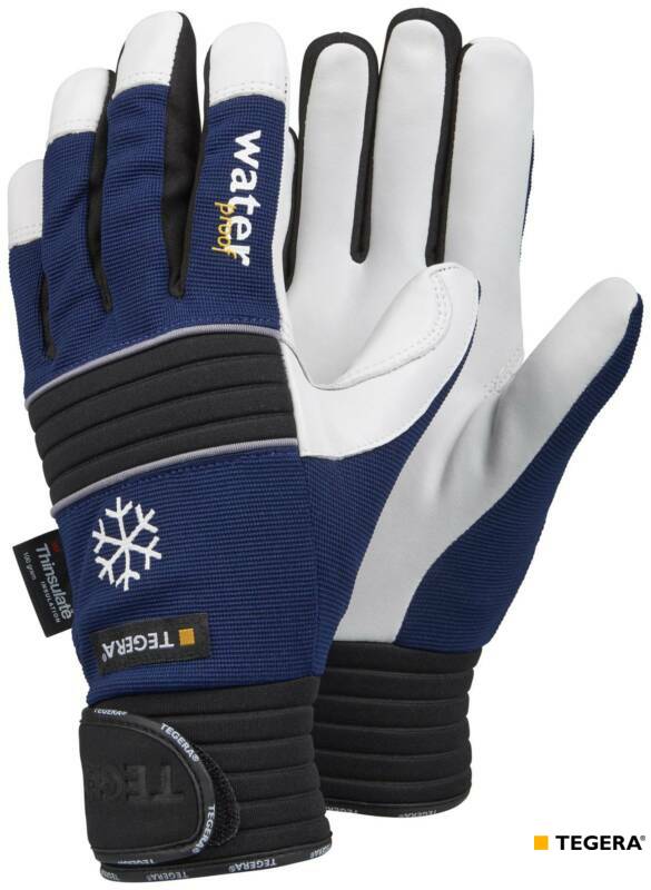 Lederhandschuh, Dick gefüttert, 0,7-0,8 mm, Vollnarben Ziegenleder, Neopren, Spandex, Thinsulate™ 100g, Cat. II, Blau, schwarz, weiß, Verstärkte Finger und Daumen, Wasserdicht, Klettverschluss, für allgemeine Arbeiten. EN 388:2003, 2111X EN 511:2006, 111