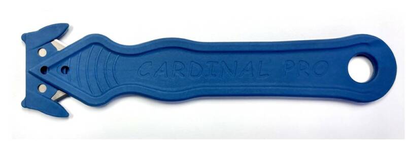 Einweg‑Sicherheitsmesser mit doppeltem Haken, ausgestattet mit einer Öse für eine Fangriemenschnur sowie zwei kleinen Klebebandtrennern aus Kunststoff. Die laminierte Klinge schützt den Inhalt der Verpackung. Metalldetektierbar.