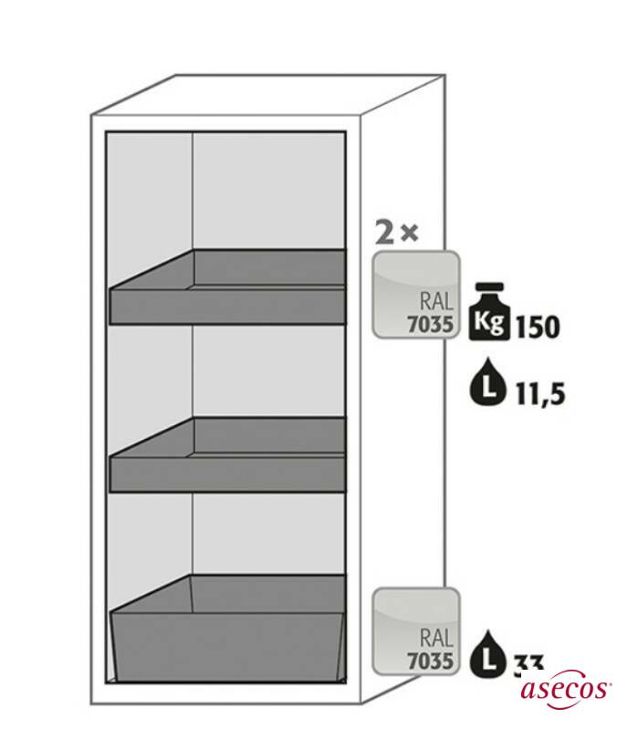 Yellow fire safe cabinet with exterior in epoxy-steel and interior with light-chemical resistant, melamine plastic finish. In the bottom of the box, there are 4 levelling feet to cope with an uneven surface. At the top of the cabinet, there is a connection point for earthing. Joints, seams and vents close automatically in the event of fire. On the outside, there are symbols and hazard signs (ISO 3864). interior : 2 collection tray with load capacity of 150kg and collection capacity of 12L, 1 bottom collection tray with 22L collection capacity. Dimensions : 596 x 616 x 1298. Weight :199,5 kg. Delivery in house is possible on request.