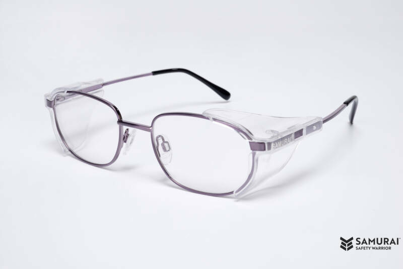 Grey metal safety glasses with polycarbonate lenses with protection against impact and dust. Equipped with a scratch-resistant layer and anti-fog coating. The side protection in clear polycarbonate and riveted.