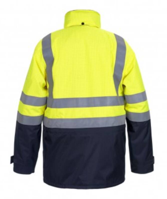 - Parka - 2 sidepockets - 2 chestpockets with flap and zipper - 2 gasdetectionloops for positioning of antennas, kabels and detectors - Napoleonpocket - Mobile phone pocket - Cuffs adjustable by Velcro - Concealed zip with double storm flap with press-studs - Double innerpocket - Hood in collar with Elasticized draw cord - Inside EN 14116 index 3; Outside EN 14116 index 1 - Possible to add lining or 0434466ON Metz, to be ordered separetly Quality: 260 g/m² 99% polyester/1% anti-static/Lining 100% cotton Available sizes: fluo orange/navy, fluo yellow/navy (S-5XL), navy (S-4XL) Available colours: fluo orange/navy, fluo yellow/navy, navy Complies with: EN 13034-6 /6, EN 1149 /5, EN ISO 14116, EN 343