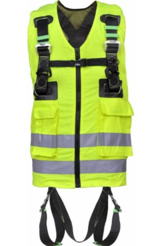 Fall harness with 2 anchor points and integrated hiviz yellow safety vest with refelctive straps. Maximum user weight: 140kg.