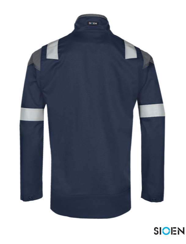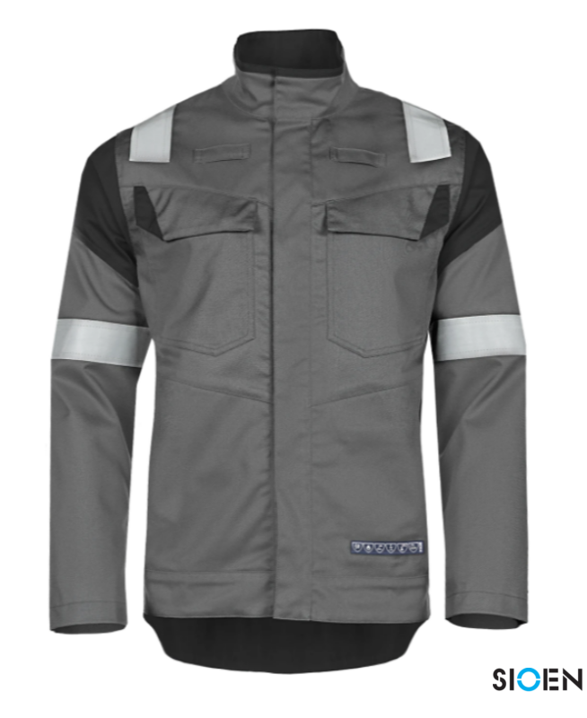 Multirnom ECO work jacket with arc flash protection, made from 50% FR cotton, 30% Tencel Lyocell, 19% recycled polyester, and 1% antistatic.