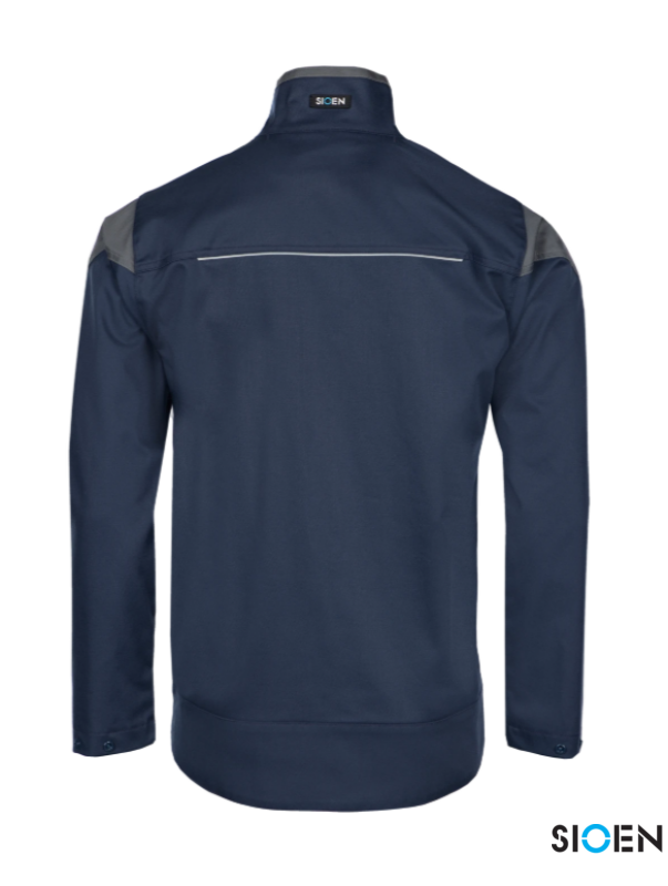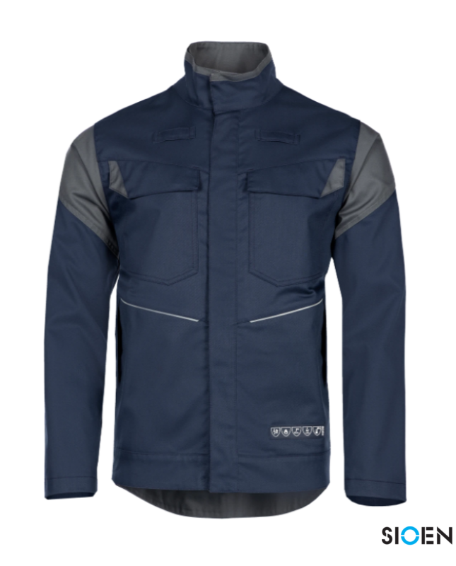 Work jacket with arc flash protection, welding class 2. Made from 79% FR cotton, 20% polyester, and 1% antistatic.