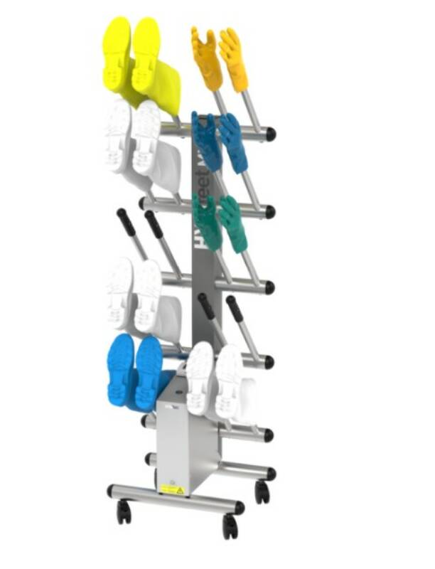 Made of epoxy-coated steel and 304L stainless steel, HYGIfeet is designed for the care of all types of footwear (tall boots and low shoes). Compact and mobile, it provides drying, internal sanitization, and deodorization. Model for 10 pairs.
