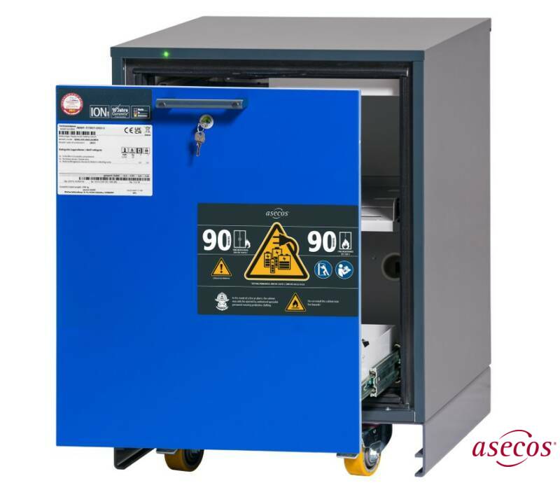 90‑minute fire‑resistant underbench cabinet, equipped with a sliding drawer and a cylinder lock with locking status indicator.