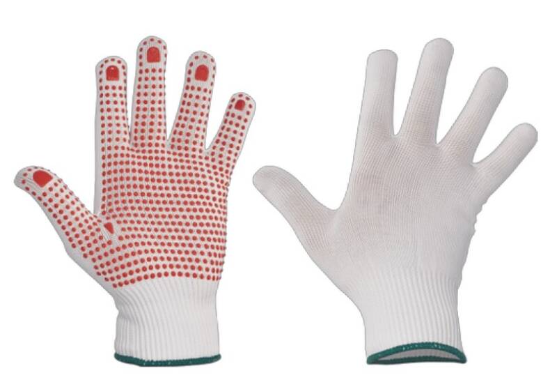 Gants tricotés blancs sans couture avec picots rouges en PVC sur la paume pour une meilleure adhérence.