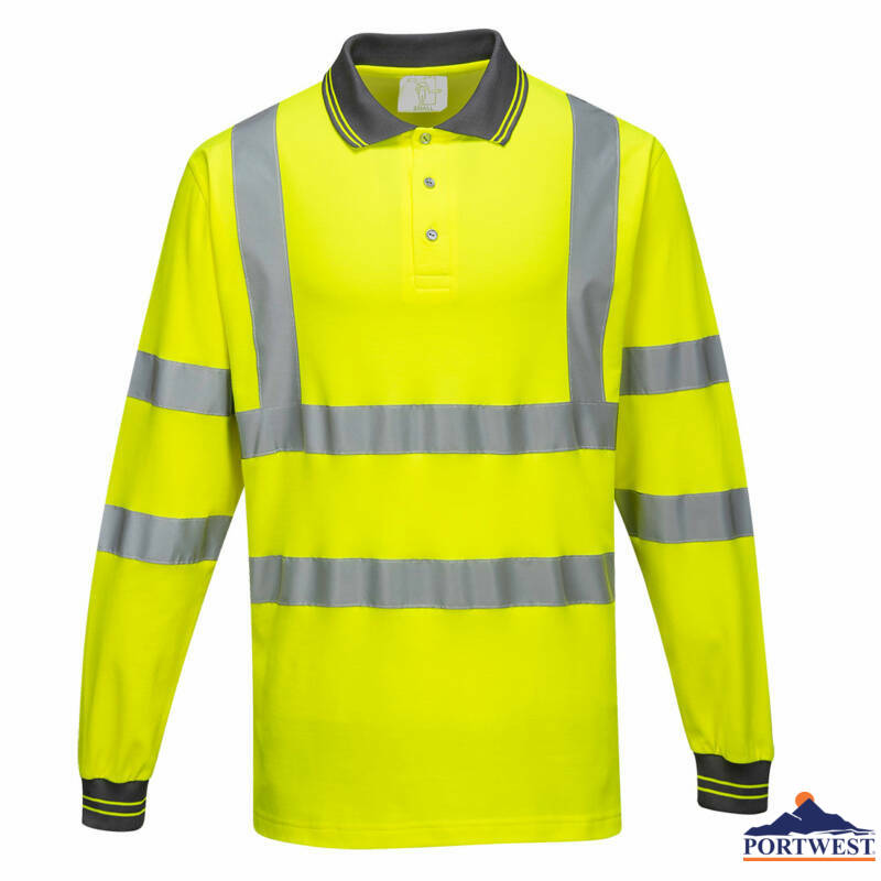 Signalisatie polo met lange mouwen, navy kraag, 3 knoopsluiting, horizontale en verticale reflecterende banden. Kwaliteit: 55% Katoen, 45% Polyester,Breisel, 175g/m². Beschikbare maten: S-3XL. Beschikbare kleuren: Fluo geel/marine, Fluo oranje/marine.