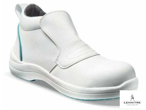 Hoge schoen in wit microfiber, voorzien van een kunststof neus. Synthetische voering. Zool in PU/PU, 2 kleuren voor het onderscheid tussen de verschillende sites. Maten: 35-42.