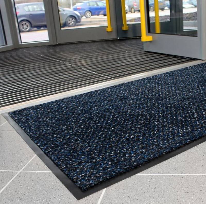Slijtvaste deurmat van polyamide tapijt. Geschikte duurzaamheid voor gebieden met veel verkeer. Vezels schrapen en vegen vocht uit schoenen voor effectieve vloerbescherming. Volledig getest op brand volgens Cfl-S1. Antislip vinylrug helpt de matpositie te behouden, zelfs op gladde vloeren. UV- en temperatuurbestendig van 0 ° C tot 60 ° C. Afmetingen: 0,9 mx 1,5 m. Grotere afmetingen op aanvraag leverbaar. Kleur: grijs / zwart.Kleur: zwart.
