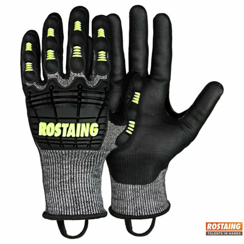 Handschoen met hoge snijbescherming en impactbescherming. Nitril coating. Zeer fijn breisel, 0,85mm. 18 gauge. Touchscreen op alle v ingers. Duimholte versteviging.
