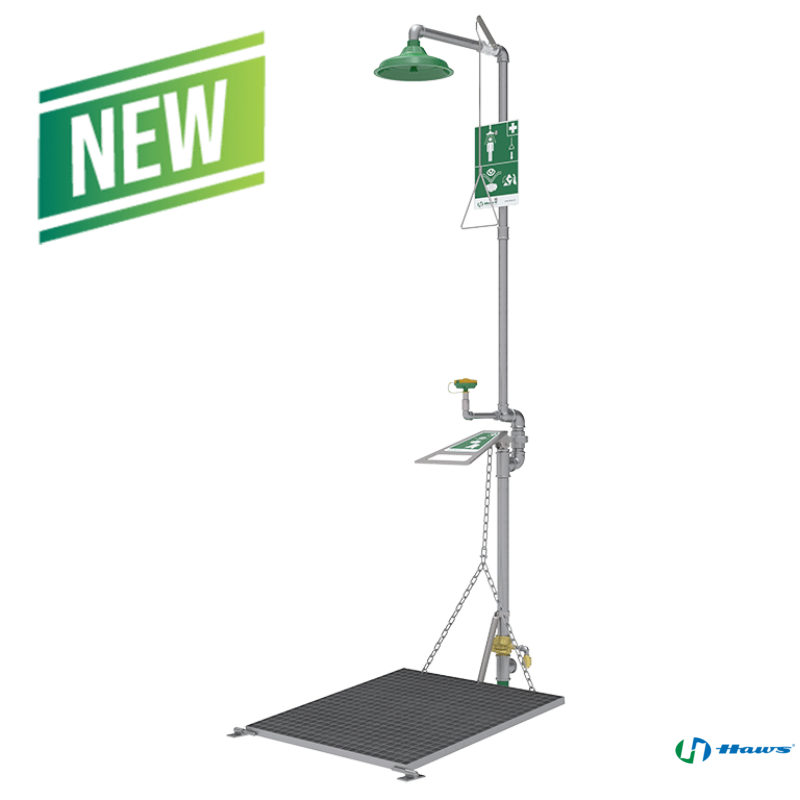 Vrijstaande combinatiedouche 8352FP AXION. Vorstbestendig ontwerp met ingebouwde klep. Geen elektriciteit nodig. Met roosteractiveri ngsplatform. Groene ABS-kunststof douchekop. AXION oogdouchekop en douchekop. 1-1/4" leidingaansluiting. Ideaal voor industrieel gebruik buitenshuis